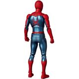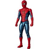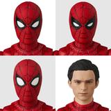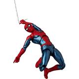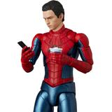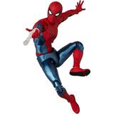As seen in the 2021 film "Spider-Man: No Way Home," Spider-Man in his new red-and-metallic-blue suit joins Medicon's "MAFEX" action-figure series! This wildly posable figure comes with four interchangeable heads, six spiderweb parts, a phone, a mask to hold in his hands, and a coffee cup, plus a figure stand with a posable arm for wall-crawling action! Order him for your own collection today!